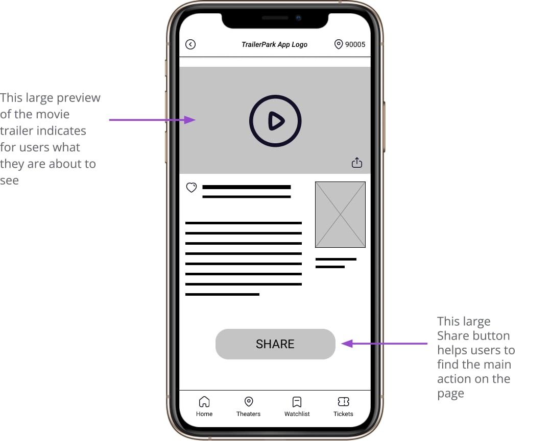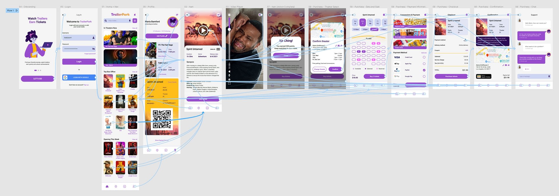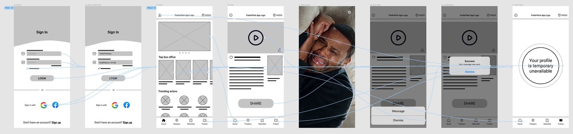 Using the completed set of digital wireframes, I created a low-fidelity prototype. The primary user flow I connected was watching a trailer and sharing it with friends, so the prototype could be used in a usability study.
